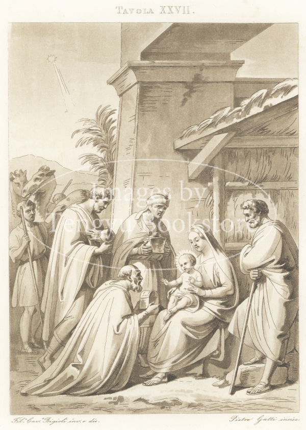アクアチント銅版画で表現されたイエス・キリストの生涯の各場面は、19世紀イタリアの画家フィリッポ・ビジョーリ(1798-1878)によるもの。