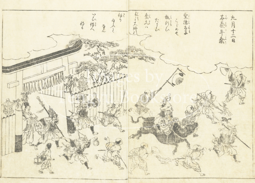 編者である京都の文人 秋里籬島(あきさと りとう)と、挿絵を手掛けた大阪の浮世絵師、竹原春朝斎(たけはらしゅんちょうさい)は、これ以後、大阪の題材にした「摂津名所図会」をはじめ、日本各地の絵入り地誌を作成することになる、「名所図絵」の第一人者です。