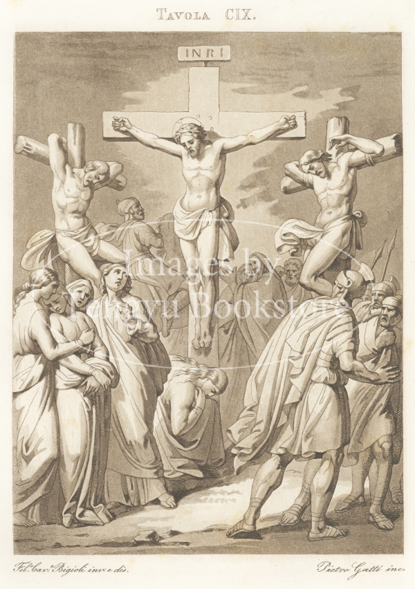 アクアチント銅版画で表現されたイエス・キリストの生涯の各場面は、19世紀イタリアの画家フィリッポ・ビジョーリ(1798-1878)によるもの。