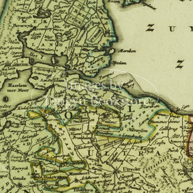 特徴的な形状の入り江ゾイデル海(現在のアイセル湖)を中央に配した本図には、オランダ本国のみならず、当時の植民地であったインドネシアのバタヴィアと、後にニューヨークとなる北米ニューアムステルダムの小地図も描き込まれており、「海上帝国」とも呼ばれた黄金時代のオランダを髣髴させる一枚となっています。