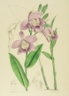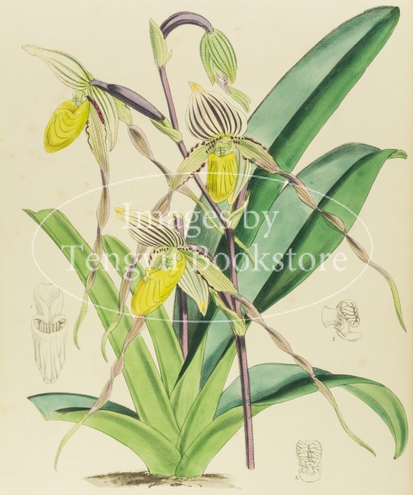 19世紀のヨーロッパで熱狂的に愛好された、華やかな色彩とグロテスクとも言える独特の形態をもつ熱帯の蘭を100種類紹介した図鑑「蘭科百選/A Century of Orchidaceous Plants」第2巻収録の図版。