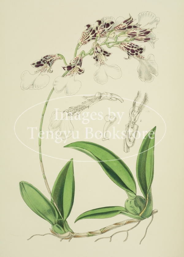 19世紀のヨーロッパで熱狂的に愛好された、華やかな色彩とグロテスクとも言える独特の形態をもつ熱帯の蘭を100種類紹介した図鑑「蘭科百選/A Century of Orchidaceous Plants」第2巻収録の図版。
