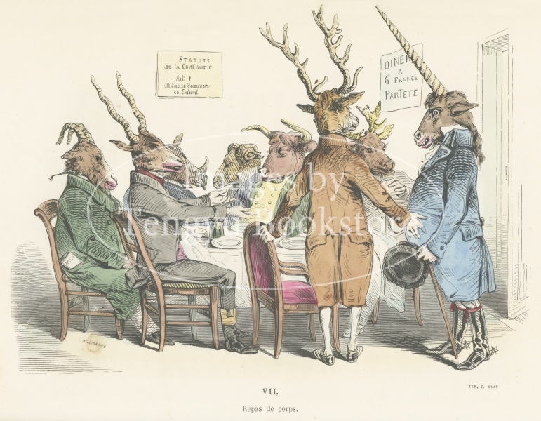 グランヴィルが得意とした、人それぞれの性格を動物にたとえて表現するこの擬人化動物のイラストは、19世紀のフランス人を典型的に描き出す風刺戯画として、発表時、大きな成功を収めました。的確な動物の描写と人間臭い仕草が融合したこれらのキャラクターは、当時とは社会情勢の変わった現代においても十二分に目を愉しませる奇想画の傑作です。