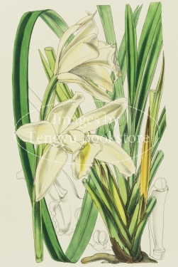 19世紀のヨーロッパで熱狂的に愛好された、華やかな色彩とグロテスクとも言える独特の形態をもつ熱帯の蘭を100種類紹介した図鑑「蘭科百選/A Century of Orchidaceous Plants」第2巻収録の図版。