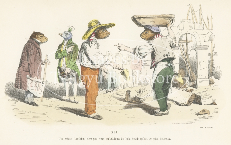 グランヴィルが得意とした、人それぞれの性格を動物にたとえて表現するこの擬人化動物のイラストは、19世紀のフランス人を典型的に描き出す風刺戯画として、発表時、大きな成功を収めました。的確な動物の描写と人間臭い仕草が融合したこれらのキャラクターは、当時とは社会情勢の変わった現代においても十二分に目を愉しませる奇想画の傑作です。