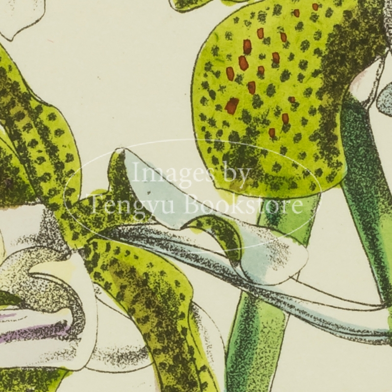 19世紀のヨーロッパで熱狂的に愛好された、華やかな色彩とグロテスクとも言える独特の形態をもつ熱帯の蘭を100種類紹介した図鑑「蘭科百選/A Century of Orchidaceous Plants」第2巻収録の図版。