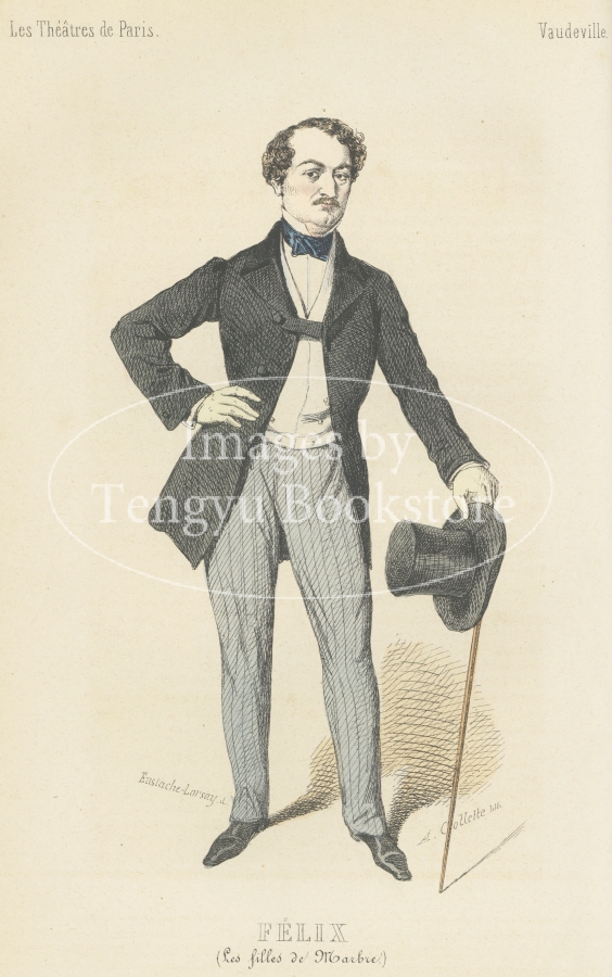 19世紀フランスの有名人を肖像画とともに紹介したシリーズ本「現代有名人のイラストギャラリー」中の第1巻「パリの劇場」収録のイラスト。挿絵画家ユスターシュ・ロルセーが当時実在したパリの舞台俳優たちを描いたもの。