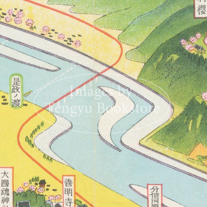 上空から斜めに見下ろした絵で地理を描くイラスト地図「鳥瞰図」を数多く手がけた大正~昭和のイラストレーター 吉田初三郎(1884-1955)による鳥瞰図の部分。