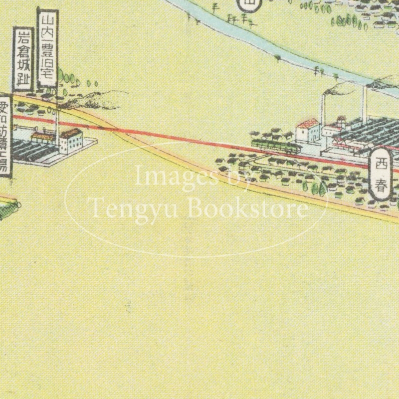 上空から斜めに見下ろした絵で地理を描くイラスト地図「鳥瞰図」を数多く手がけた大正~昭和のイラストレーター 吉田初三郎(1884-1955)による鳥瞰図の部分。