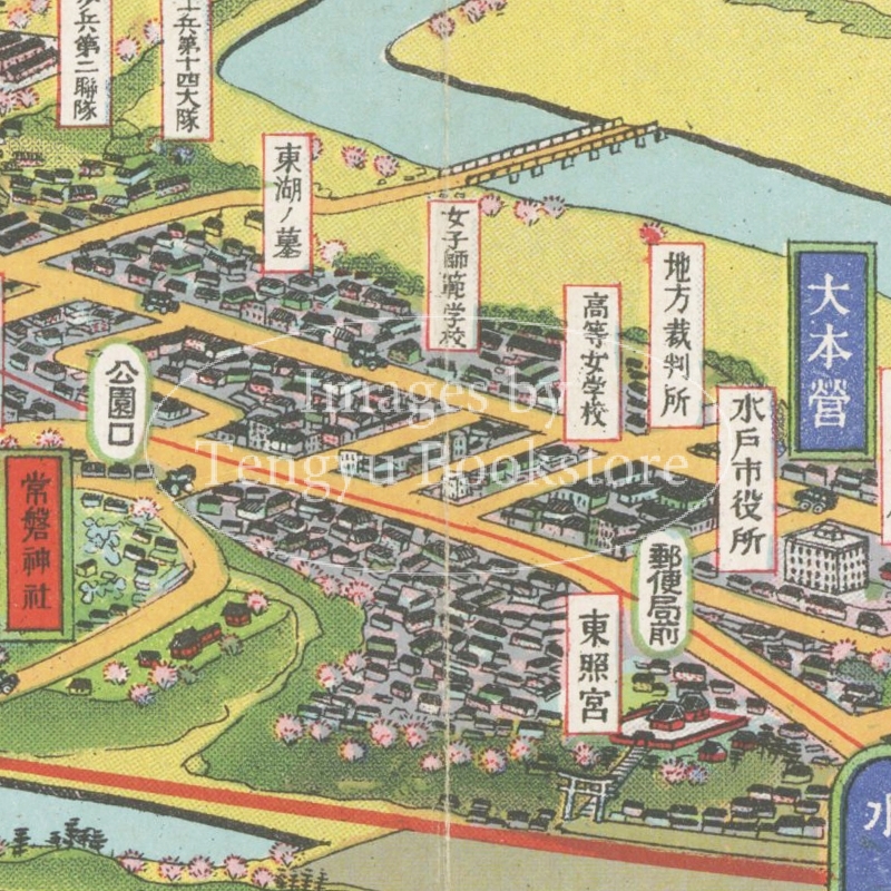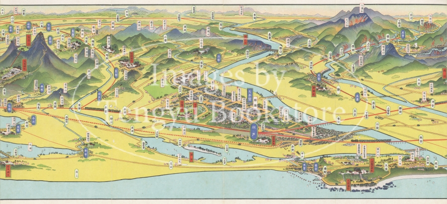 上空から斜めに見下ろした絵で地理を描くイラスト地図「鳥瞰図」を数多く手がけた大正~昭和のイラストレーター 吉田初三郎(1884-1955)による鳥瞰図の部分。
