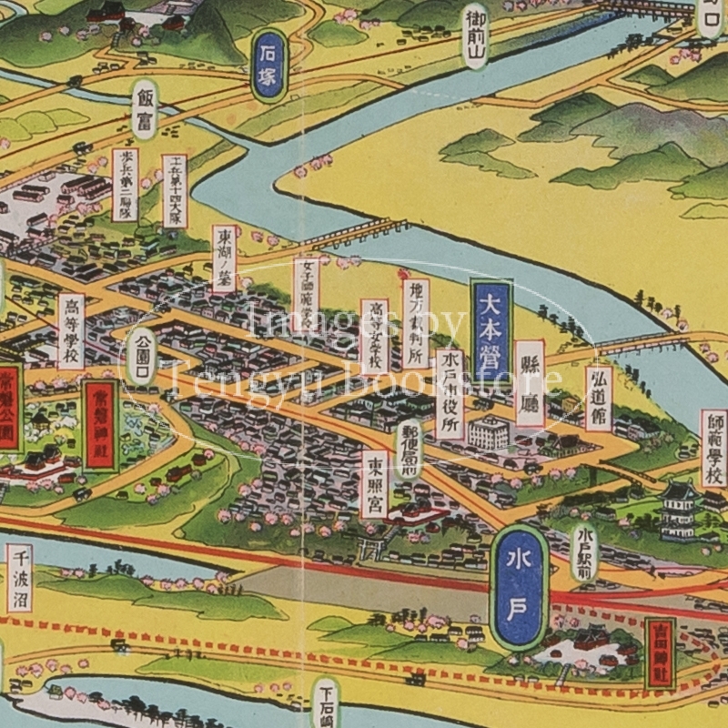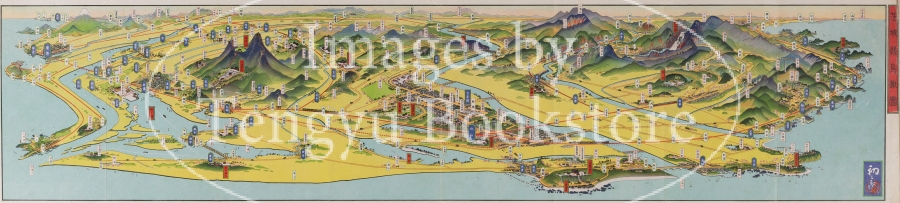 上空から斜めに見下ろした絵で地理を描くイラスト地図「鳥瞰図」を数多く手がけた大正~昭和のイラストレーター 吉田初三郎(1884-1955)による鳥瞰図。