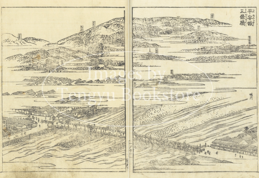 東海道とは、京都から愛知や静岡を通って江戸に至る街道のこと。本書は、当時数多くの名所図会を編纂した京都の文人 秋里籬島(あきさと りとう)によるもの。