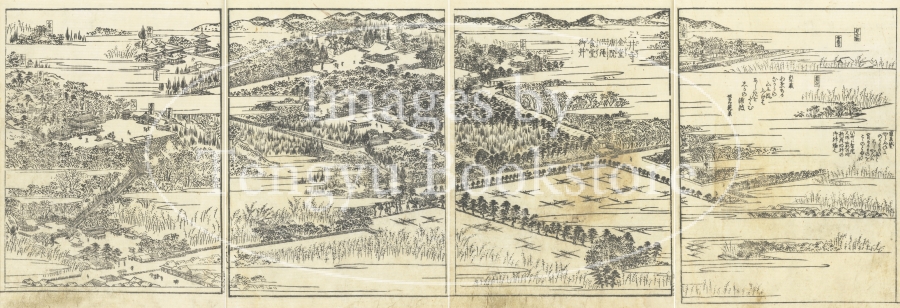 東海道とは、京都から愛知や静岡を通って江戸に至る街道のこと。本書は、当時数多くの名所図会を編纂した京都の文人 秋里籬島(あきさと りとう)によるもの。