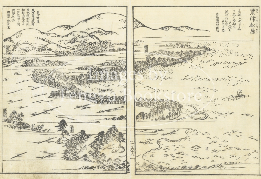 東海道とは、京都から愛知や静岡を通って江戸に至る街道のこと。本書は、当時数多くの名所図会を編纂した京都の文人 秋里籬島(あきさと りとう)によるもの。