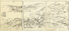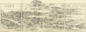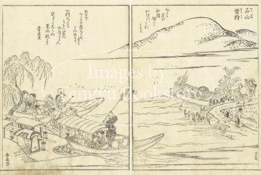 東海道とは、京都から愛知や静岡を通って江戸に至る街道のこと。本書は、当時数多くの名所図会を編纂した京都の文人 秋里籬島(あきさと りとう)によるもの。