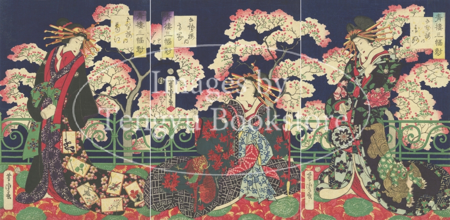 幕末・明治の浮世絵師 歌川芳虎による三枚続美人画。
