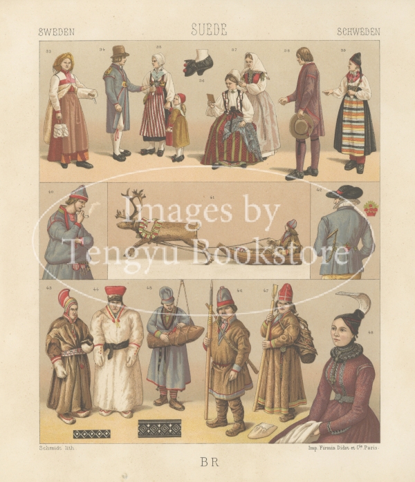 多色刷石版によってカラー印刷された、世界の歴史的衣装や民族衣装の図は、資料的な価値はもちろん、美術的にも評価の高い貴重なイラストです。