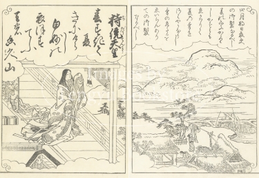 江戸前期から中期にかけて活躍した京都の絵師 西川祐信(にしかわ すけのぶ:1671-1750)による百人一首の絵本「花陽百人一首大成」からの一枚。