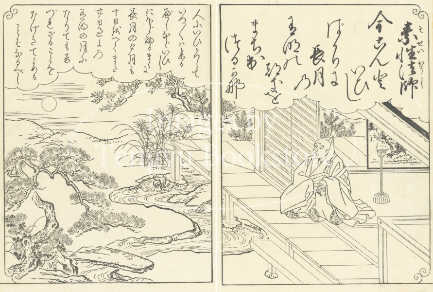 江戸前期から中期にかけて活躍した京都の絵師 西川祐信(にしかわ すけのぶ:1671-1750)による百人一首の絵本「花陽百人一首大成」からの一枚。
