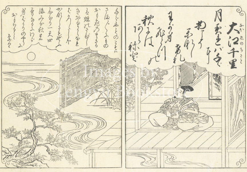 江戸前期から中期にかけて活躍した京都の絵師 西川祐信(にしかわ すけのぶ:1671-1750)による百人一首の絵本「花陽百人一首大成」からの一枚。