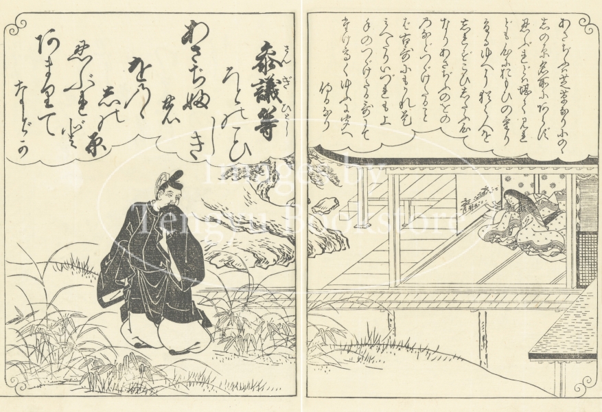 江戸前期から中期にかけて活躍した京都の絵師 西川祐信(にしかわ すけのぶ:1671-1750)による百人一首の絵本「花陽百人一首大成」からの一枚。