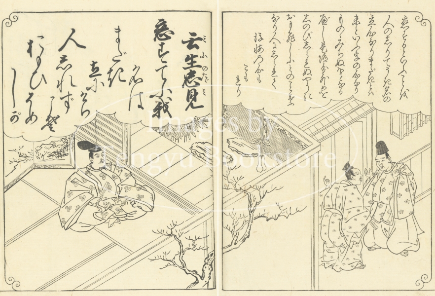 江戸前期から中期にかけて活躍した京都の絵師 西川祐信(にしかわ すけのぶ:1671-1750)による百人一首の絵本「花陽百人一首大成」からの一枚。