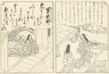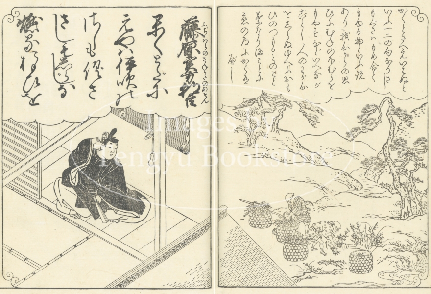 江戸前期から中期にかけて活躍した京都の絵師 西川祐信(にしかわ すけのぶ:1671-1750)による百人一首の絵本「花陽百人一首大成」からの一枚。