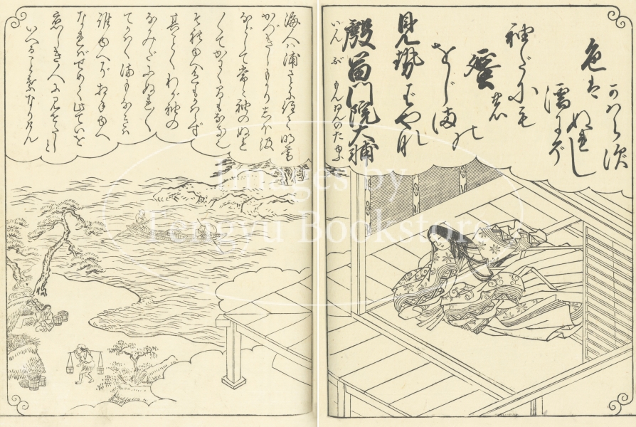 江戸前期から中期にかけて活躍した京都の絵師 西川祐信(にしかわ すけのぶ:1671-1750)による百人一首の絵本「花陽百人一首大成」からの一枚。
