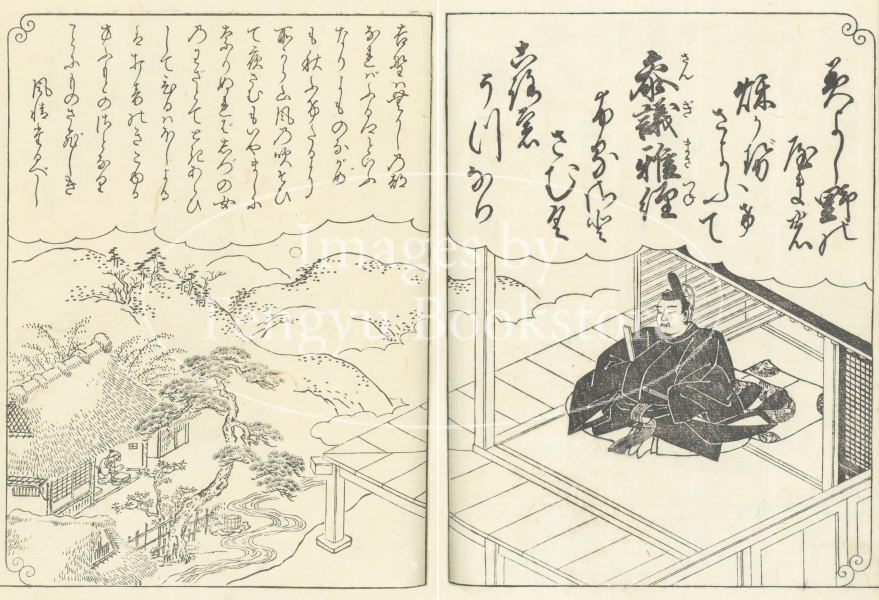 江戸前期から中期にかけて活躍した京都の絵師 西川祐信(にしかわ すけのぶ:1671-1750)による百人一首の絵本「花陽百人一首大成」からの一枚。