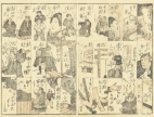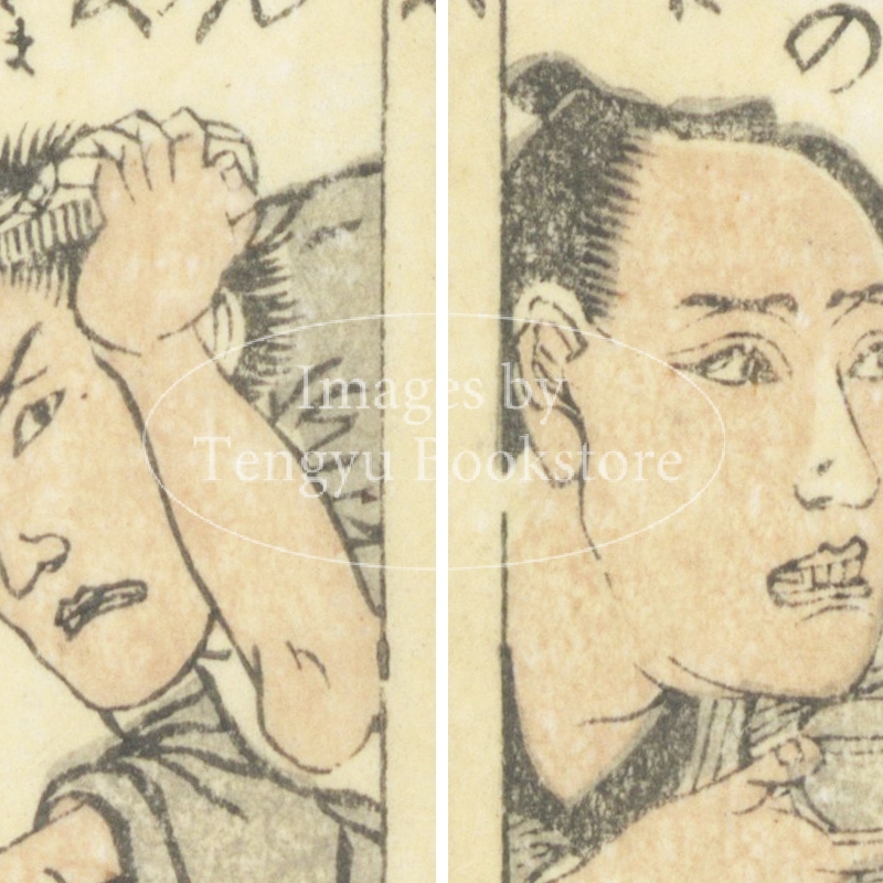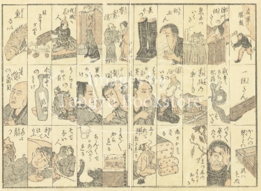 いわゆる「謎かけ」と呼ばれる三段謎を集めた草双紙で、上中下の三段に区切った枠の中にお題と答えを絵入りで描いたもの。「上段」とかけて「中段」と解く、その心は「下段」と読む。
