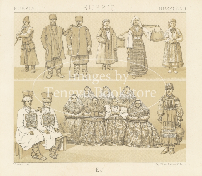 多色刷石版によってカラー印刷された、世界の歴史的衣装や民族衣装の図は、資料的な価値はもちろん、美術的にも評価の高い貴重なイラストです。