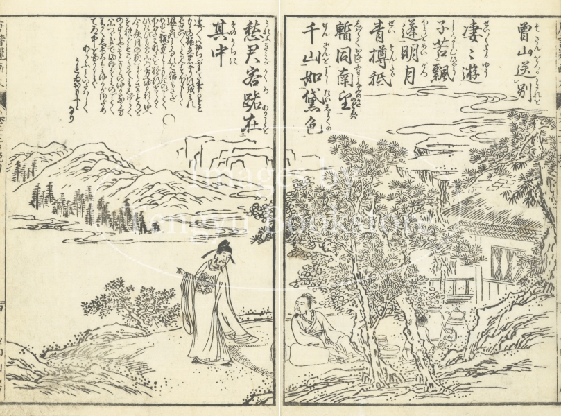 明代中国で編纂された唐代中国詩の選集「唐詩選」に、江戸時代後期の文学者 高井蘭山による解説と北斎ほか当時の絵師たちが挿絵を加えた挿絵本「唐詩選画本(とうしせんえほん)」中の挿絵。