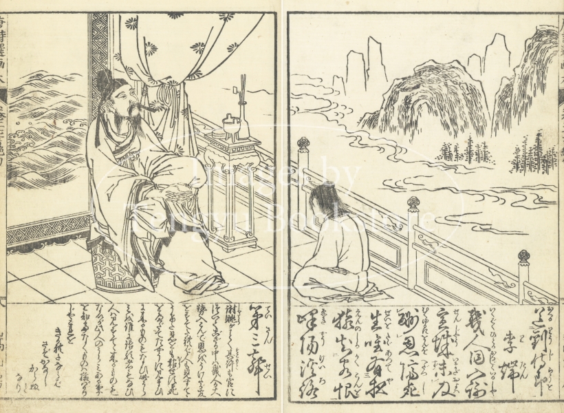 明代中国で編纂された唐代中国詩の選集「唐詩選」に、江戸時代後期の文学者 高井蘭山による解説と北斎ほか当時の絵師たちが挿絵を加えた挿絵本「唐詩選画本(とうしせんえほん)」中の挿絵。