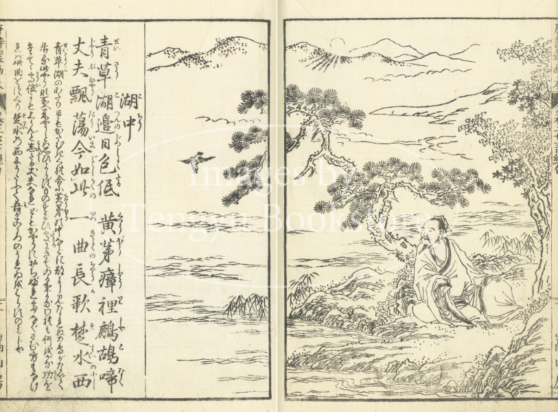 明代中国で編纂された唐代中国詩の選集「唐詩選」に、江戸時代後期の文学者 高井蘭山による解説と北斎ほか当時の絵師たちが挿絵を加えた挿絵本「唐詩選画本(とうしせんえほん)」中の挿絵。