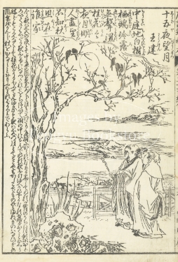 明代中国で編纂された唐代中国詩の選集「唐詩選」に、江戸時代後期の文学者 高井蘭山による解説と北斎ほか当時の絵師たちが挿絵を加えた挿絵本「唐詩選画本(とうしせんえほん)」中の挿絵。