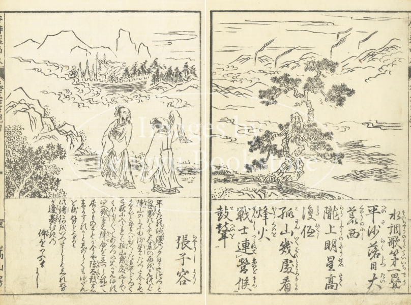 明代中国で編纂された唐代中国詩の選集「唐詩選」に、江戸時代後期の文学者 高井蘭山による解説と北斎ほか当時の絵師たちが挿絵を加えた挿絵本「唐詩選画本(とうしせんえほん)」中の挿絵。