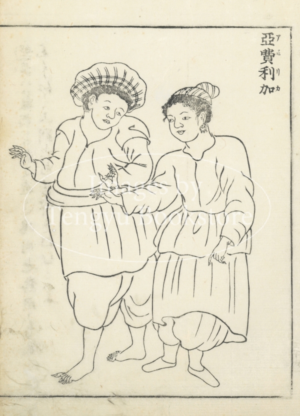 江戸時代中期の天文・地理学者 西川如見(にしかわ じょけん:1648-1724)による世界の民族図誌「万国人物図説」(四十二国人物図説)収録の挿絵。