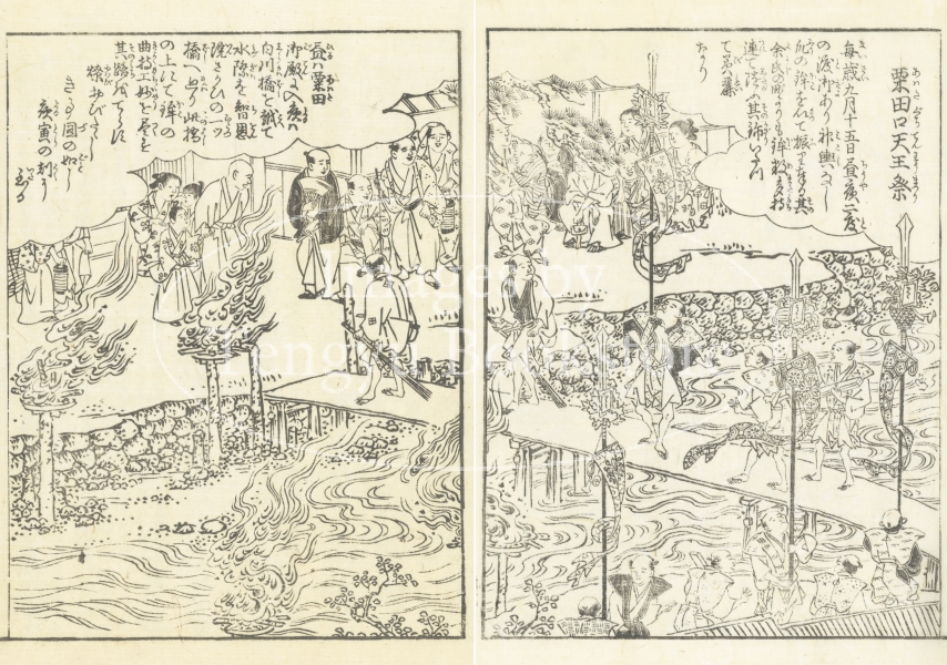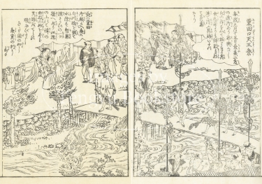 大阪の浮世絵師、蔀関月(しとみ かんげつ:1747-1797)が挿絵を手がけた本書は、京都の三条大橋から伊勢神宮までの道のりを中心に描いたもの。