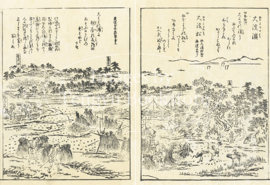 大阪の浮世絵師、蔀関月(しとみ かんげつ:1747-1797)が挿絵を手がけた本書は、京都の三条大橋から伊勢神宮までの道のりを中心に描いたもの。