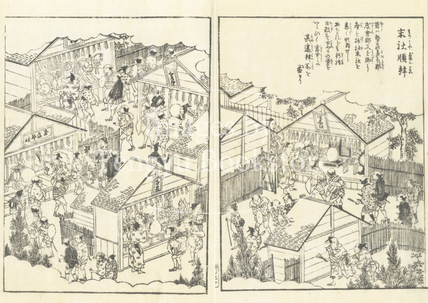 大阪の浮世絵師、蔀関月(しとみ かんげつ:1747-1797)が挿絵を手がけた本書は、京都の三条大橋から伊勢神宮までの道のりを中心に描いたもの。