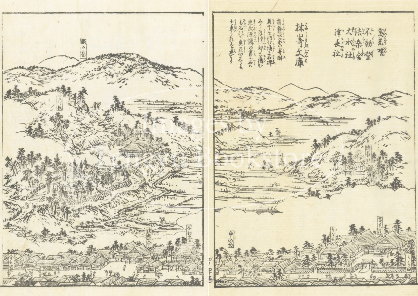 大阪の浮世絵師、蔀関月(しとみ かんげつ:1747-1797)が挿絵を手がけた本書は、京都の三条大橋から伊勢神宮までの道のりを中心に描いたもの。