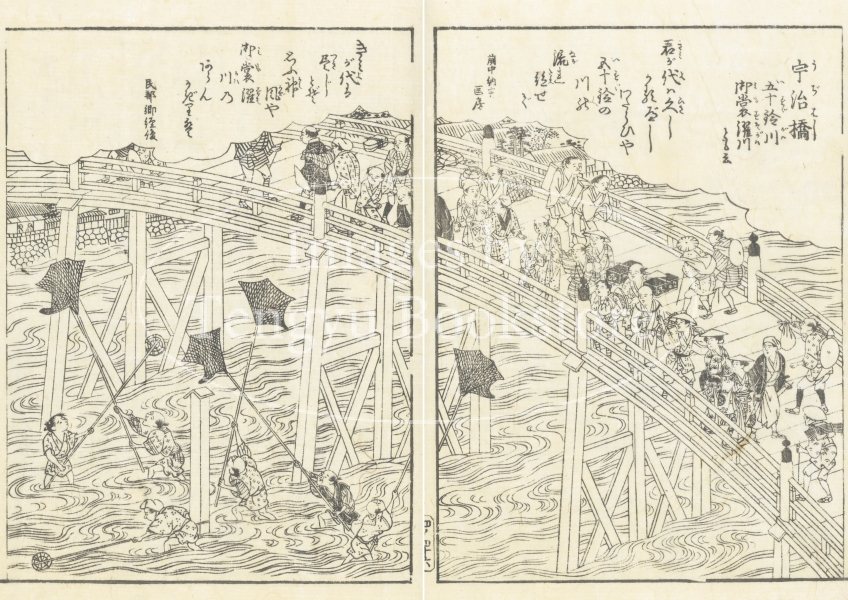 大阪の浮世絵師、蔀関月(しとみ かんげつ:1747-1797)が挿絵を手がけた本書は、京都の三条大橋から伊勢神宮までの道のりを中心に描いたもの。