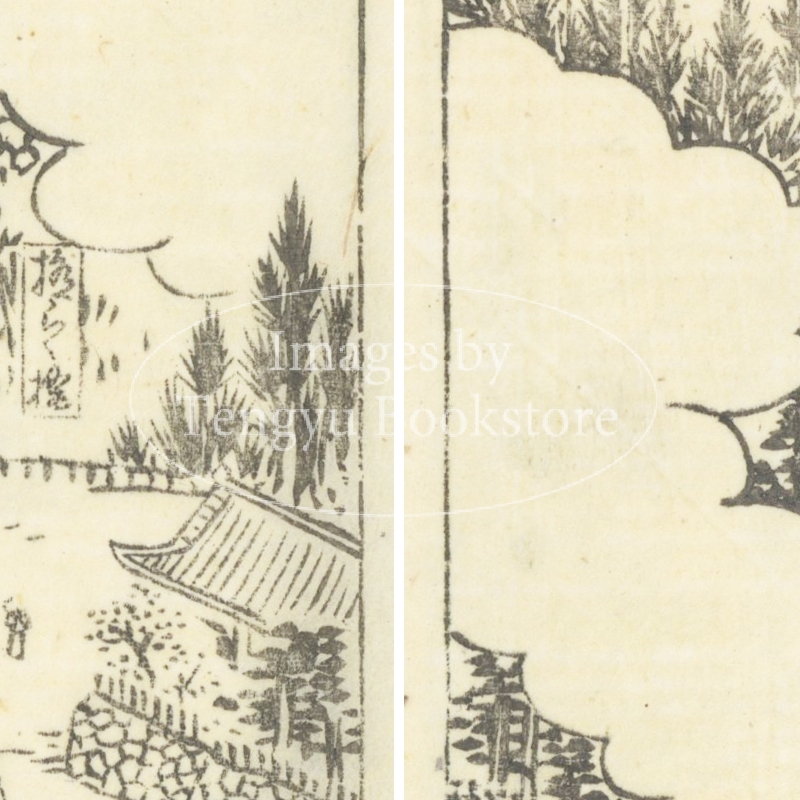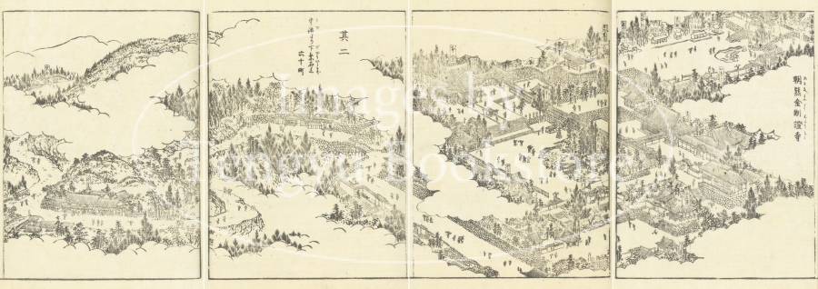 大阪の浮世絵師、蔀関月(しとみ かんげつ:1747-1797)が挿絵を手がけた本書は、京都の三条大橋から伊勢神宮までの道のりを中心に描いたもの。