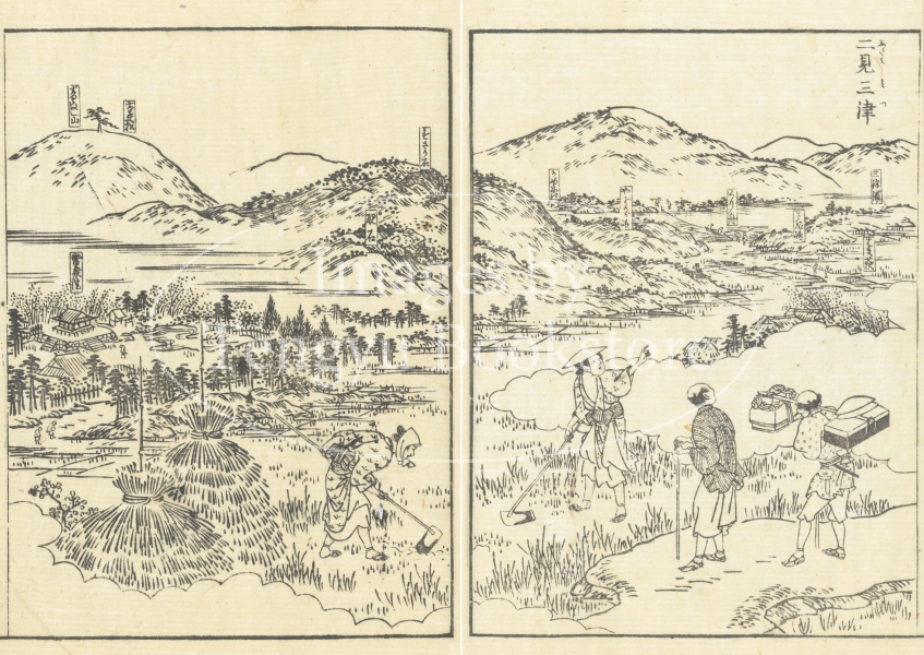 大阪の浮世絵師、蔀関月(しとみ かんげつ:1747-1797)が挿絵を手がけた本書は、京都の三条大橋から伊勢神宮までの道のりを中心に描いたもの。