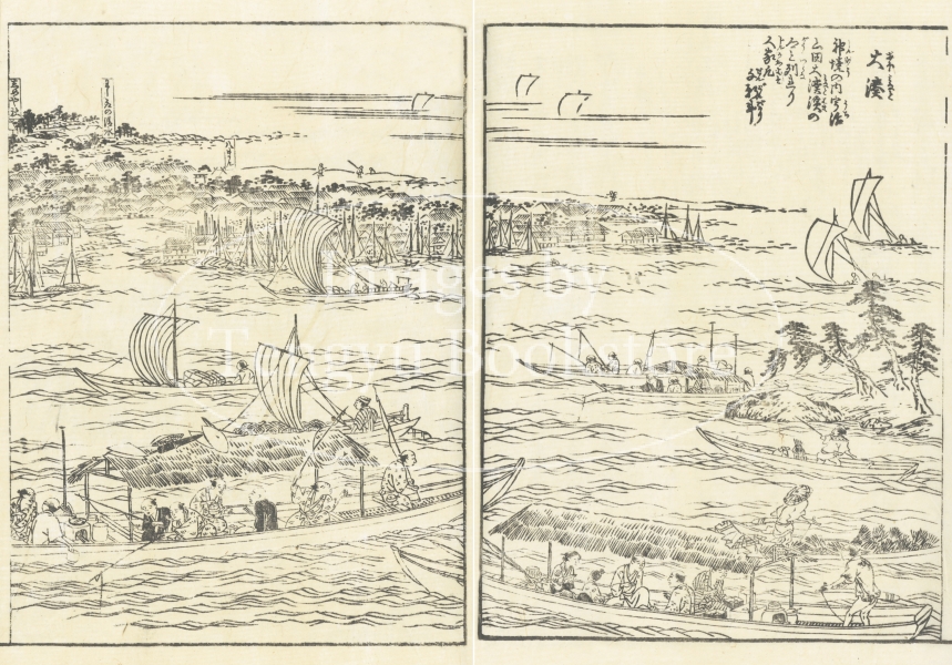 大阪の浮世絵師、蔀関月(しとみ かんげつ:1747-1797)が挿絵を手がけた本書は、京都の三条大橋から伊勢神宮までの道のりを中心に描いたもの。