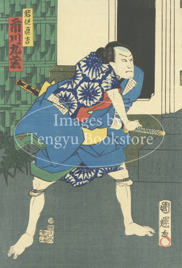 江戸末期〜明治時代の浮世絵師 二代目歌川国輝(1830-1874)による、歌舞伎役者 市川九蔵を描いた役者絵。
