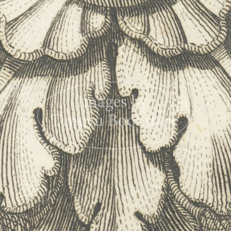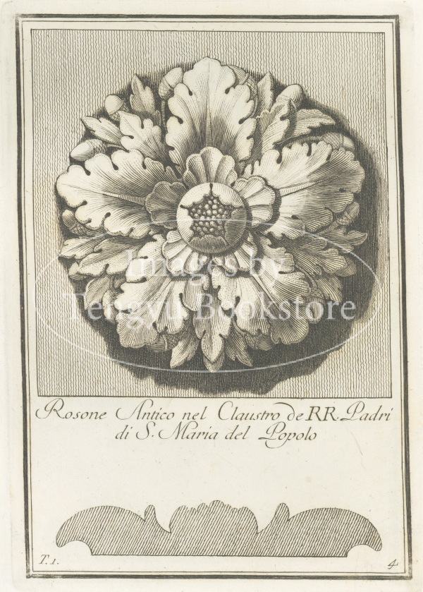 18世紀イタリアの建築家カルロ・アントニーニ(1740-1821)が、古代ローマの建築に用いられた花形の装飾文様「ロゼット」の様々なデザインを収集した装飾図案集中の1図。