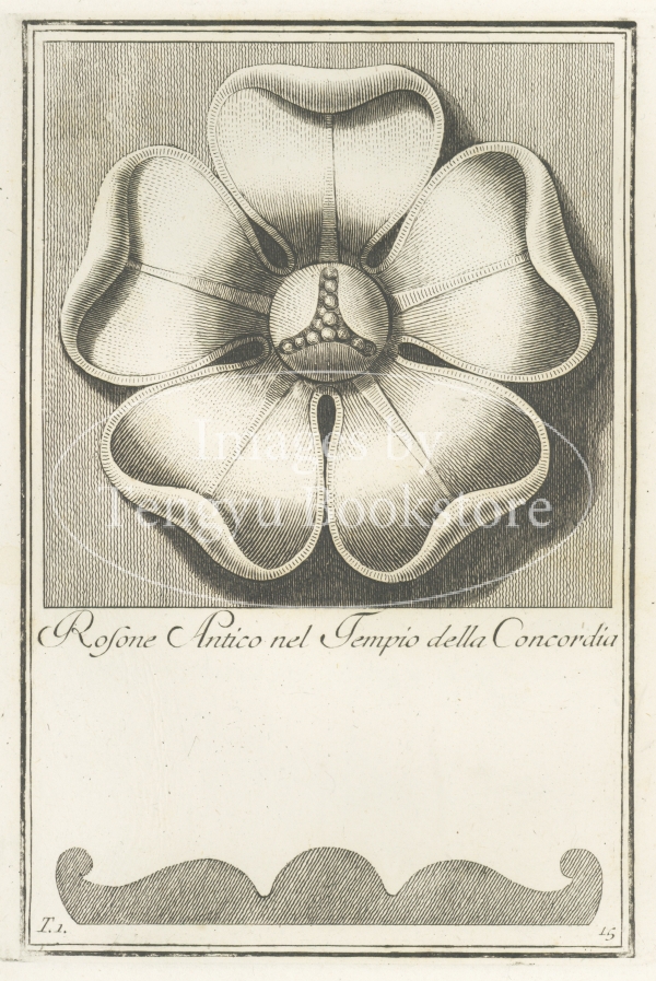 18世紀イタリアの建築家カルロ・アントニーニ(1740-1821)が、古代ローマの建築に用いられた花形の装飾文様「ロゼット」の様々なデザインを収集した装飾図案集中の1図。