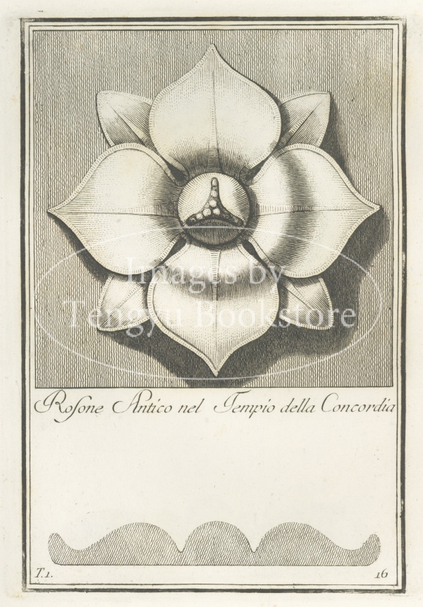 18世紀イタリアの建築家カルロ・アントニーニ(1740-1821)が、古代ローマの建築に用いられた花形の装飾文様「ロゼット」の様々なデザインを収集した装飾図案集中の1図。