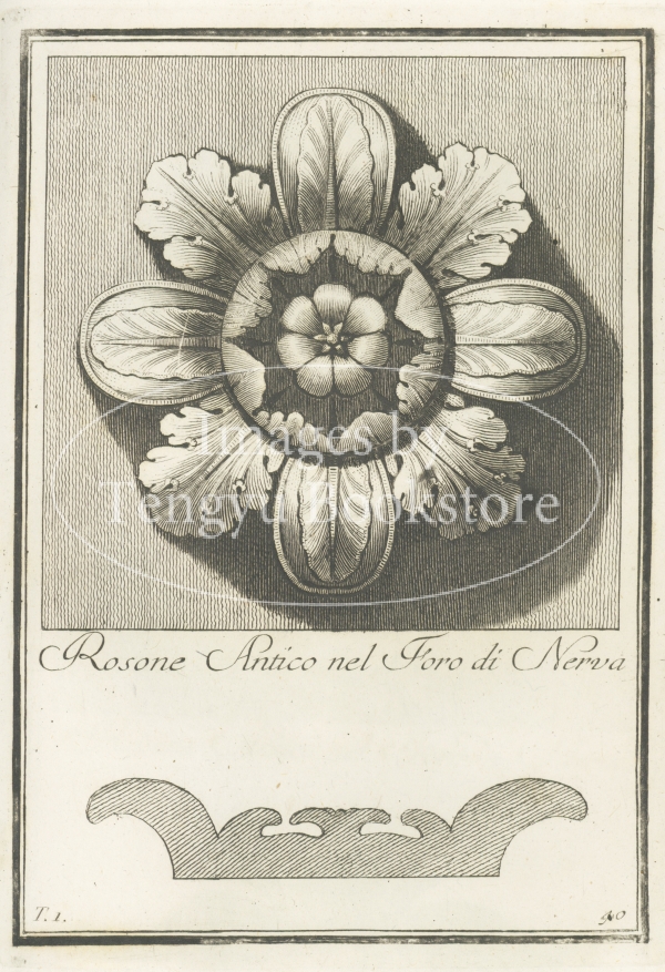 18世紀イタリアの建築家カルロ・アントニーニ(1740-1821)が、古代ローマの建築に用いられた花形の装飾文様「ロゼット」の様々なデザインを収集した装飾図案集中の1図。